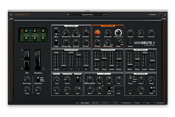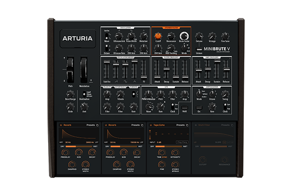El MiniBrute V permite modificar y transformar su energía analógica con un rack de efectos integrado que incluye 4 ranuras y 17 tipos diferentes de efectos para dar forma y mejorar el sonido.