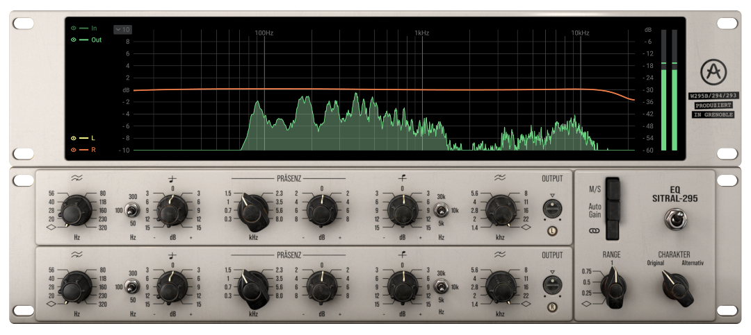EQ SITRAL-295 – Basado en la carísima consola de emisión Siemens™ de los años 70, este ecualizador estéreo clásico con suaves curvas musicales y una cálida sensación de transistor, ahora en la palma de tu mano.