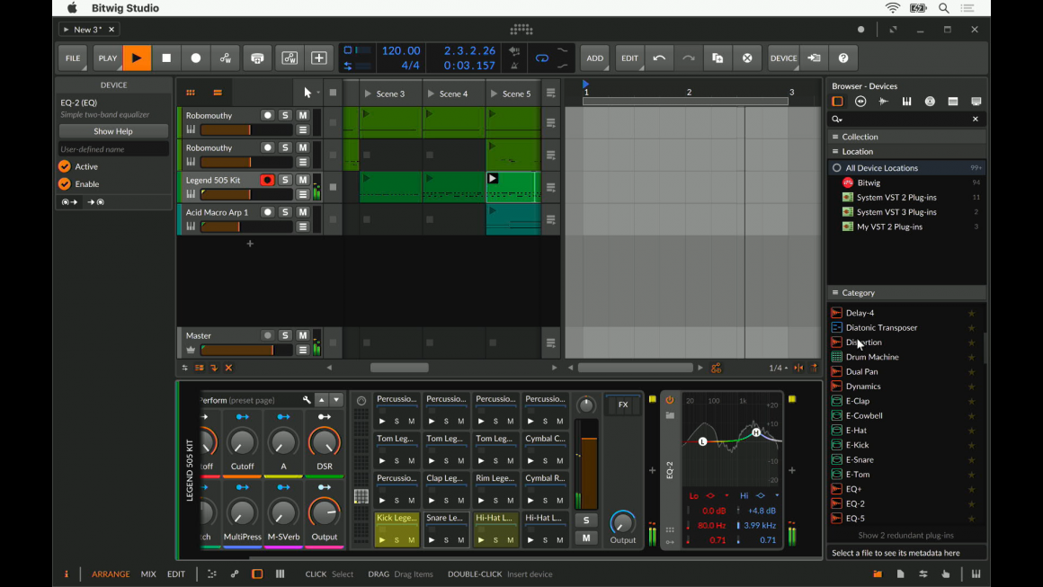 Bitwig Studio dispone de un completo paquete de más de 90 instrumentos, efectos y otras herramientas creativas entre las que cabe destacar herramientas de diseño sonoro como Polymer, el potente y versátil sampler llamado… Sampler, el sintetizador de modulación y distorsión de fase Phase-4, la sencilla e intuitiva caja de ritmos Drum Machine procesadores como el EQ+ o un eficaz simulador de amplificadores llamado Amp, los sofisticados procesadores de eventos MIDI Arpeggiator y Micro-Pitch, y muchas más.