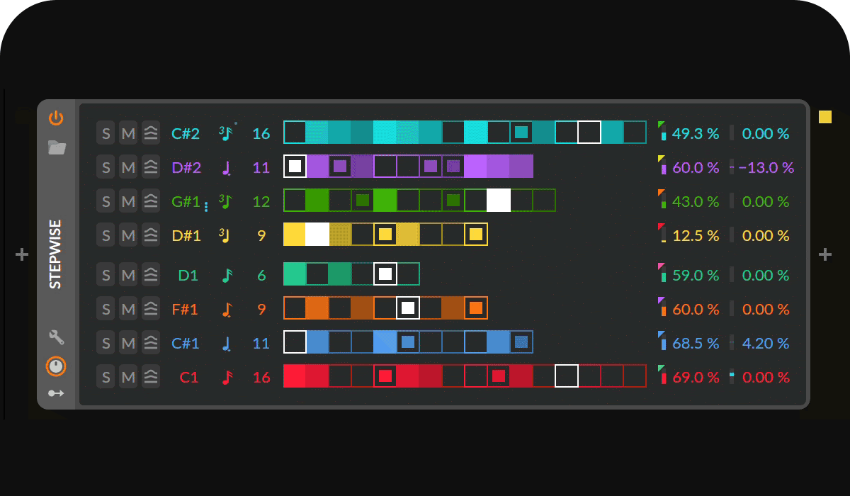 Bitwig incorpora Stepwise, un dispositivo de notas que redefine la secuenciación por patrones. Con ocho filas para disparar diferentes notas y longitudes independientes por pista, permite crear grooves tanto convencionales como experimentales.