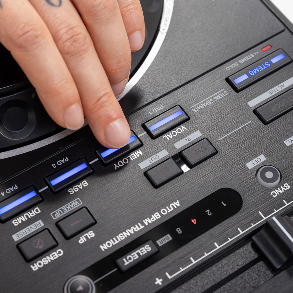 La unidad también cuenta con botones de control Stems únicos para mash-ups y remixes en vivo, lo que te permite reproducir o silenciar individualmente diferentes partes de cualquier pista, como la batería o las voces.
