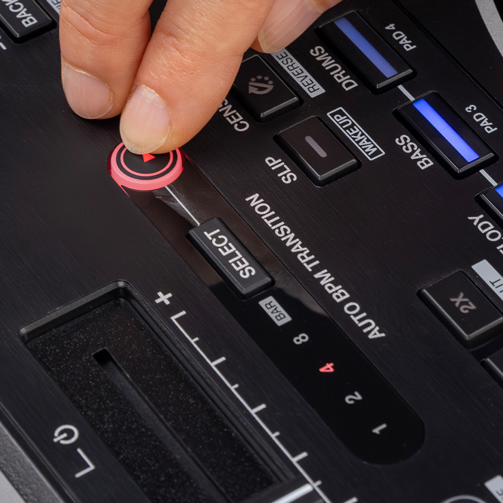 Nueva Transición de BPM Automático Mezclar entre géneros musicales con tempos muy diferentes es fácil en el DDJ-REV5, gracias a la nueva función de Transición de BPM Automático. Elige un número de compases para la transición y, al presionar el botón dedicado, la pista que se está reproduciendo cambiará gradualmente el tempo para que coincida con la pista cargada en el otro deck, permitiéndote mezclar o agregar la nueva pista en el momento perfecto.