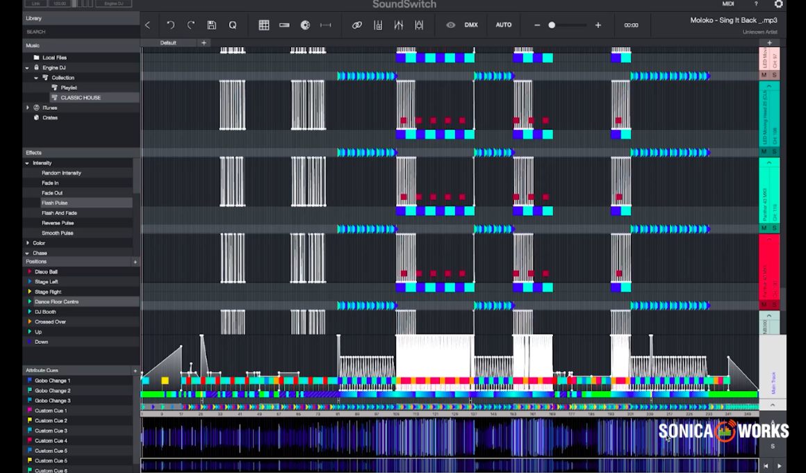SoundSwitch es la solución líder en control de iluminación. Los DJs pueden crear shows o escenas de iluminación a medida, automáticamente sincronizados con los archivos de audio cuando se reproducen en directo desde el software de DJ.