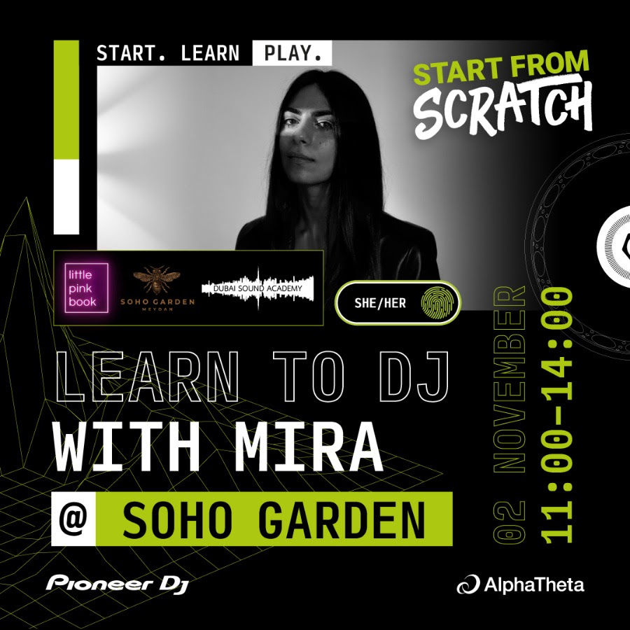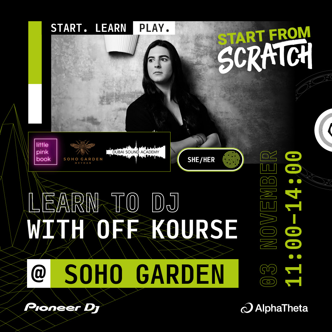 Se ofrecerán cuatro talleres gratuitos de Start From Scratch en el reconocido club Soho Garden, en colaboración con Little Pink Book y la Dubai Sound Academy. Los talleres se realizarán los días 2 y 3 de noviembre de 2024. Las sesiones de la mañana tendrán una política estricta: solo mujeres podrán estar en la sala, incluido el personal del recinto, para crear un ambiente cómodo y respetuoso con las preferencias culturales o personales de las asistentes. Ellie Donovan, Marketing Executive de AlphaTheta, comentó: “Estamos muy orgullosos de llevar a cabo nuestros primeros talleres de DJ en la región MENA. Están diseñados para ser inclusivos y culturalmente sensibles, con un enfoque especial en empoderar el talento femenino. Esta iniciativa es un paso importante para crear espacios donde las mujeres puedan explorar su pasión por la música y el DJing en un ambiente que respete sus preferencias.”