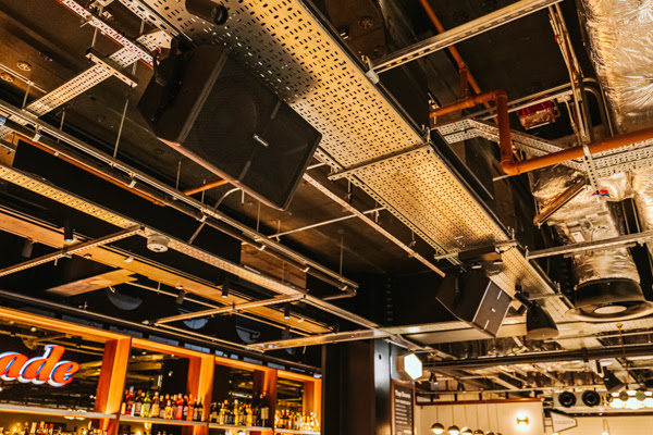 La mayor parte del sistema en Arcade Battersea comprende más de 40 montajes de techo de 8″ Pioneer PRO AUDIO CM-S58T, que están unidos a las vigas del techo y las bandejas de cables en el espacio del techo. Esta disposición minimiza la necesidad de que un solo altavoz alcance a más de unos cuatro o cinco metros.