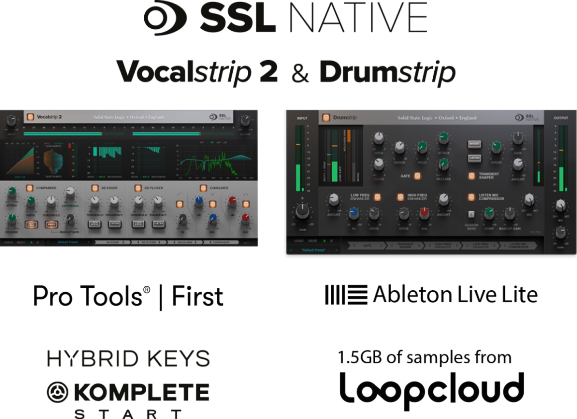 Además de FlexVerb y X-comp, el paquete de software gratuito con tu interfaz SSL 2 o SSL 2+ también incluye licencias completas de SSL Native Vocalstrip 2 y plug-ins DrumStrip, junto con instrumentos virtuales de calidad profesional, muestras y DAWs de nuestros socios en Native Instruments, Loopcloud, Ableton y Pro Tools (por un valor total de más de 800 euros) que te ofrecen todo lo que necesita para comenzar tu viaje creativo por el camino de SSL, o mejorar tu flujo de trabajo con una selección de herramientas de producción de primera clase de los maestros de la producción de audio.