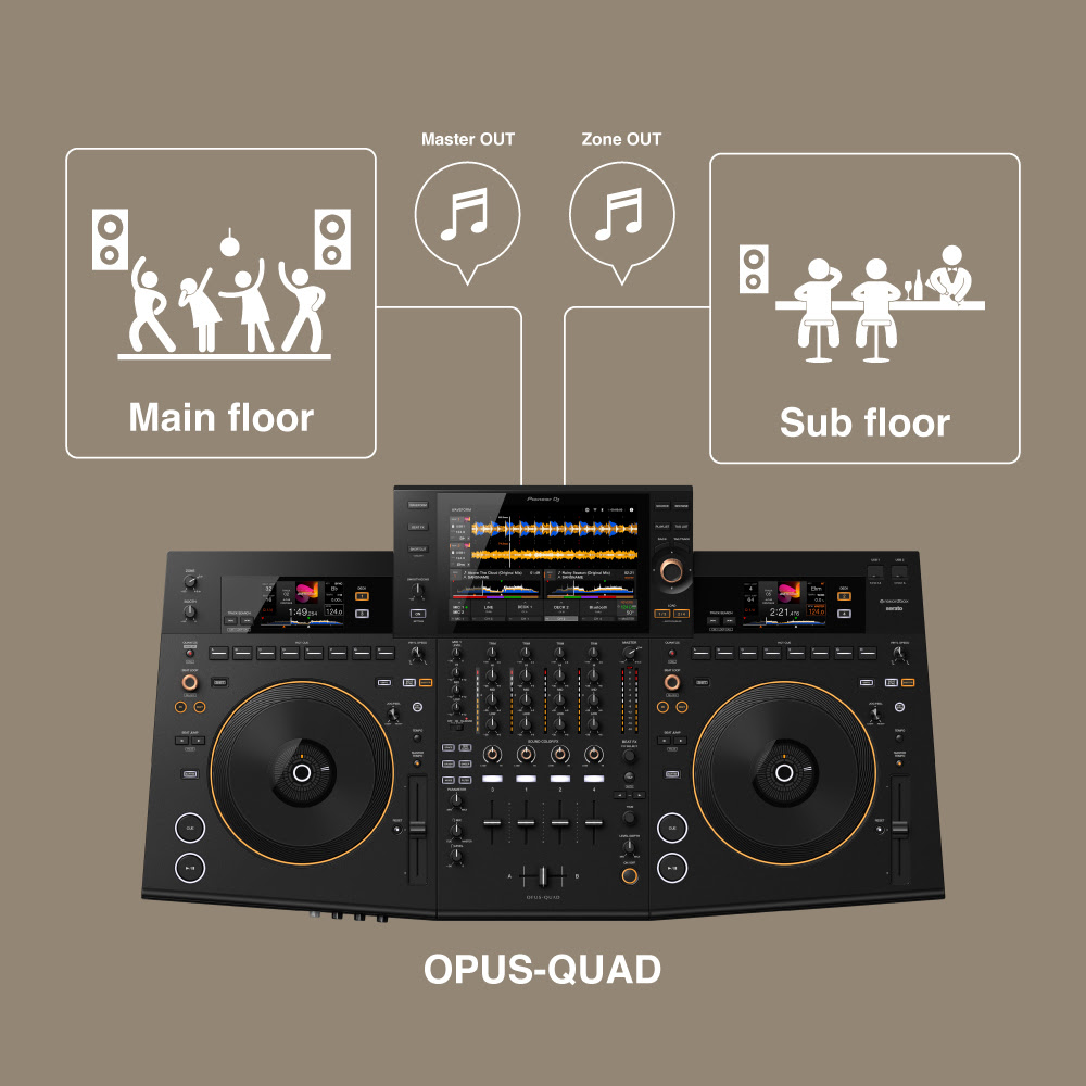 ¿Tienes una solicitud urgente de canción? Puedes encontrar pistas incluso en las bibliotecas de música más grandes más rápido que nunca, gracias a la gran pantalla táctil y el nuevo selector giratorio en el OPUS-QUAD, que te permiten seleccionar canciones que se ajusten a la ocasión. El diseño de las secciones de los decks también está diseñado para que tocar sea cómodo y fácil, y cada uno tiene una pantalla para que puedas mantener un ojo en la información de la pista de cada deck sin tener que cambiar tu mirada. Y con la salida de zona, incluso tienes la opción de emitir sonido que sea independiente del audio principal, dándote la opción de reproducir diferentes géneros de música en diferentes salas de un lugar desde solo una unidad. Esto, combinado con todas las características y efectos evolucionados de la unidad, te brinda más flexibilidad y un mayor control de la música.