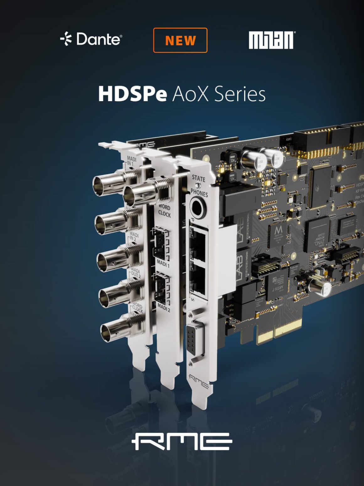 La serie HDSPe AoX consiste en dos tarjetas de interfaz de audio PCIe x4: la HDSPe AoX-M (AVB) y HDSPe AoX-D (Dante). Estas tarjetas combinan puertos de red duales con salida de auriculares, AES3, MIDI y cabezales de expansión internos para hasta cuatro puertos MADI. Las HDSPe AoX pueden ser ampliadas con hasta 512 canales mediante los conectores opcionales AoX-MADI-EXT-BNC y AoX-MADI-EXT-SFP.