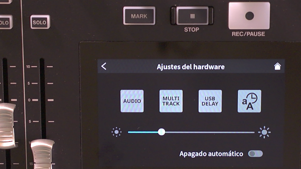 En el menú Ajustes del hardware encontramos algunos parámetros importantes del sistema. Debajo de los cuatro botones cuyas opciones veremos en un momento, tenemos un control de brillo de la pantalla y una opción de apagado automático, que se activa transcurrido un tiempo de inactividad.