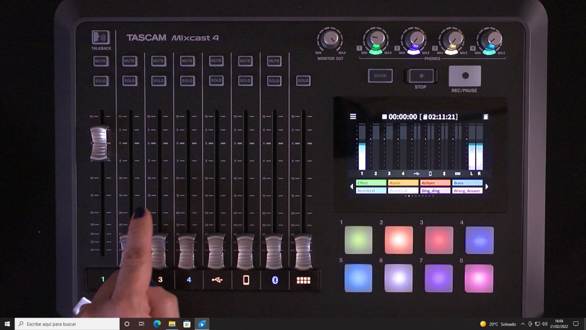 Pero hablemos de la Mixcast 4, que es de lo que se trata hoy. Resumiendo mucho, la Mixcast 4 es una estación de producción que permite grabar podcasts de calidad profesional combinando 4 canales de micrófono, audio a través de USB, audio procedente de smartphone, audio a través de Bluetooth, y efectos en tiempo real. Todo ello se configura y controla a través de una interfaz de usuario super intuitiva equipada con una pantalla táctil de 5 pulgadas, una sección de mezcla dotada de 8 faders de largo recorrido, una sección de 8 pads de efectos, y otros controles que permiten personalizar los diversos parámetros de mezcla y grabación de un total de hasta 14 canales de audiodirectamente en una tarjeta SD. Todo eso lo veremos en detalle a lo largo de este vídeo…