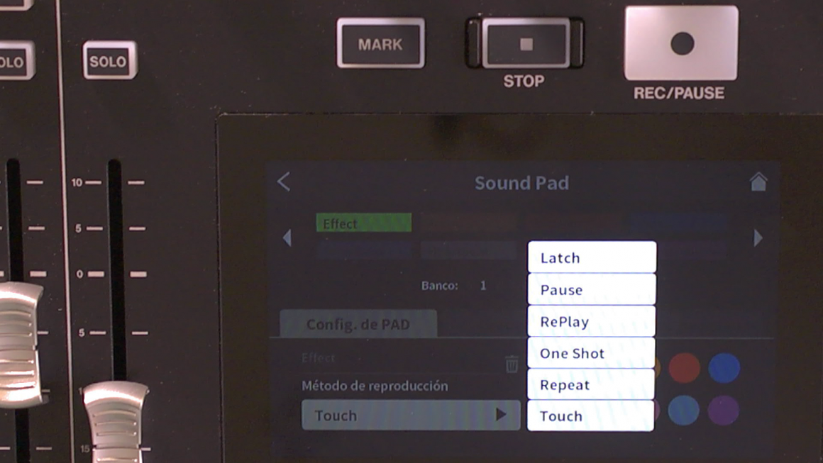 - En la primera pestaña tenemos seguramente la más importante: el modo de reproducción. Podemos elegir el comportamiento de cada pad, por ejemplo, «Latch» para que se reproduzca de principio a fin, o «Touch» de manera que el sonido asociado sólo se reproducirá mientras mantengas pulsado el pad, y así hasta 6 opciones de reproducción distintas. A la derecha la selección de color. Observa que al cambiar el color en la pantalla táctil, también cambia automáticamente el color del pad en el panel superior de la Mixcast 4.