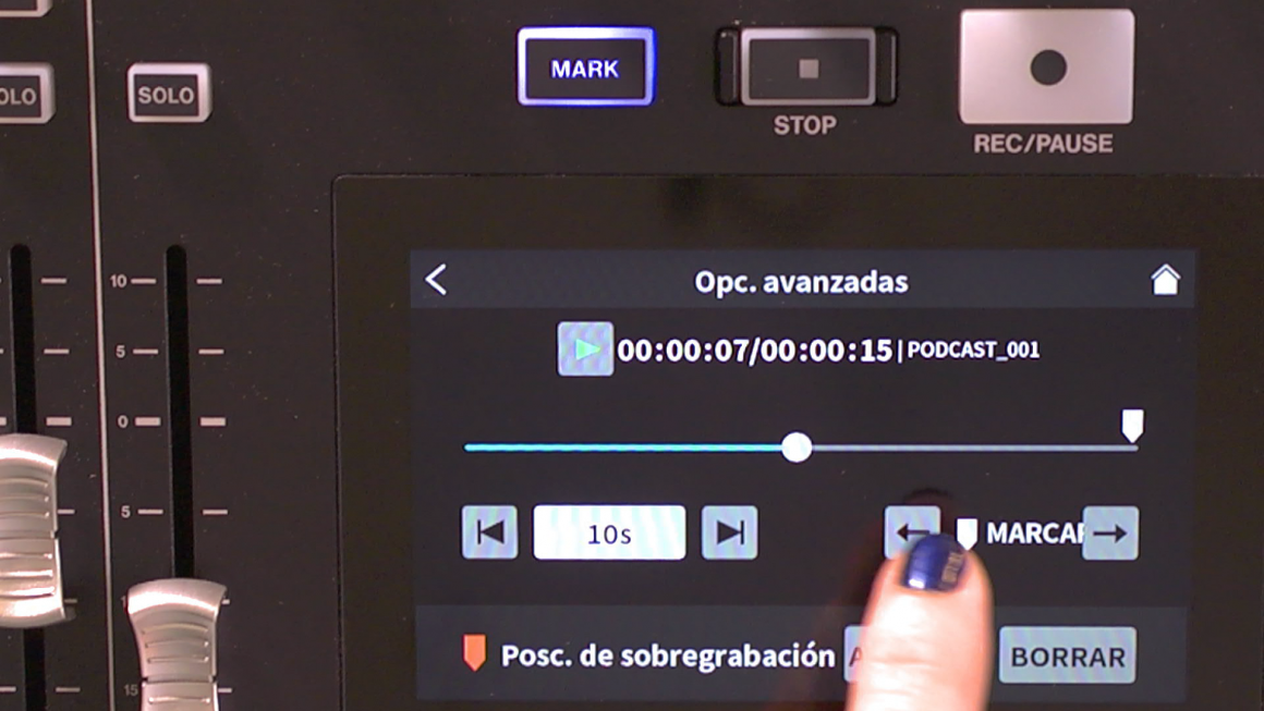 - Y por último, en la parte inferior podemos establecer el punto donde (si es necesario, por ejemplo para corregir un error) se iniciará la sobregrabación. Para ajustar el punto exacto, desplazamos el punto de reproducción al lugar deseado y pulsamos «Ajustar». Ahora ya sólo queda pulsar el botón «REC» de la Mixcast 4…