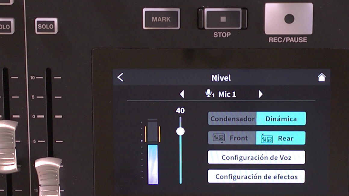 Ah, por cierto, antes de que se olvide, todos los canales de micro disponen de las mismas opciones que el canal 1. Sólo hay una excepción: el canal Mic 1 puede usar el micrófono conectado en la entrada de micro 1 del panel trasero o la entrada TRRS del panel frontal, en la que, como decía antes, puedes conectar un set de micrófono + auriculares estándar. Esta opcion Frontal / Trasero, como puedes ver, sólo está disponible en el canal 1.