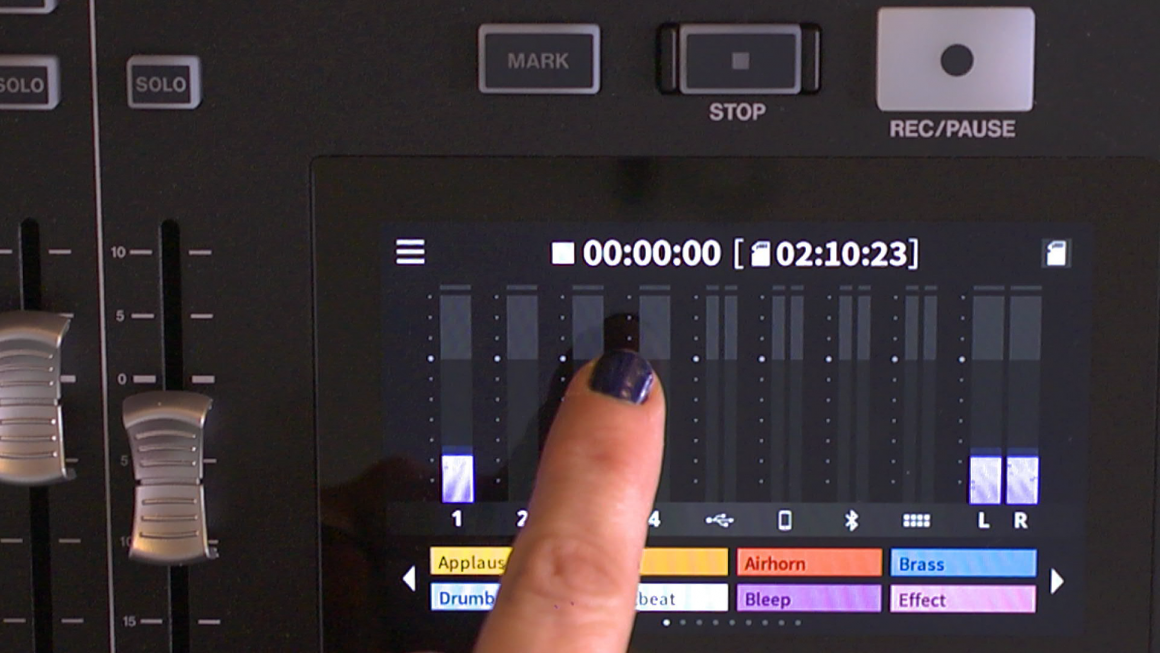 Lo primero que vemos al poner en funcionamiento la Mixcast 4 es la pantalla del mezclador. Como puedes ver, aquí aparecen reflejados cuatro canales mono –correspondientes a los cuatro canales de micro– y cuatro estéreo, que tal como indican los iconos de la parte inferior corresponden a los canales USB, TRRS, Bluetooth y el canal de los pads de efectos. En el extremo derecho del visor aparece representado el nivel de señal del canal master L y R, que se distingue del resto por su mayor grosor. En la parte superior de la pantalla vemos un contador de tiempo de grabación transcurrido y tiempo de grabación disponible en la tarjeta SD, expresado en horas minutos y segundos; en la parte inferior de la pantalla vemos las etiquetas de los efectos de sonido cargados en la memoria de la Mixcast 4, que corresponden con los colores de los pads de efectos que están situados debajo de la pantalla. Pulsando las flechas izquierda / derecha podrás desplazarte a través de los 8 bancos de 8 efectos que puedes cargar en la memoria de la Mixcast 4.