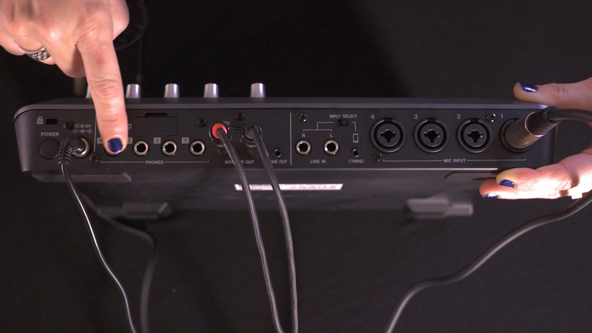 - Y por último –aunque quizá sea precisamente lo más importante– las cuatro entradas de micro. Se trata de conectores combo que admiten tanto conectores jack de 6,35 mm como conectores XLR. Si usas micrófonos de condensador, estas entradas pueden suministrar a tus micros la alimentación phantom que necesitan para funcionar. Más adelante, lo veremos cuando repasemos las opciones de configuración de los canales de micro…